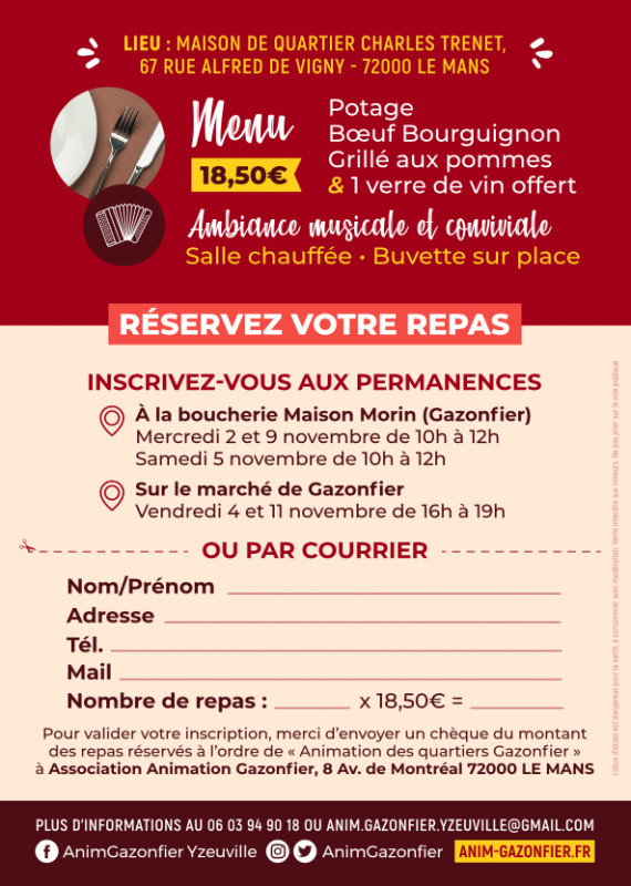 Venez partager un moment de convivialité avec votre famille, vos voisins et amis lors de la soirée beaujolais nouveau de Gazonfier dans une ambiance guinguette et champêtre. Nous vous accueillerons pour une simple dégustation 2€ ou bien autour d'un repas chaud servi à table à la Maison de quartier Charles Trenet avec une formule repas sur réservation à 18,50€ (potage - boeuf bourguigon - tartelette aux pommes - 1 verre compris).