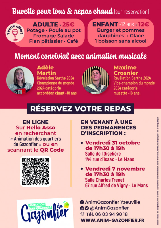 🥳 L’association de quartiers organise sa traditionnelle et conviviale soirée dégustation de beaujolais nouveau avec repas du terroir dans une ambiance champêtre et guinguette avec animation de deux jeunes talents accordéonistes - révélations Sarthe 2024 🪗